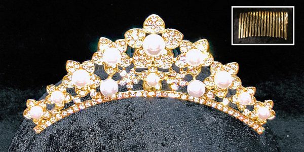 - Design: The tiara comb features a floral motif, with intricately crafted flower blossoms serving as the focal point of the design. These flowers are adorned with pearls and rhinestones, adding sparkle and glamour to the accessory.