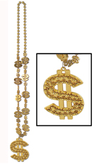 This gold plastic bead necklace is 33″ long and has dollar signs on it. There is one larger Dollar Sign at the bottom.