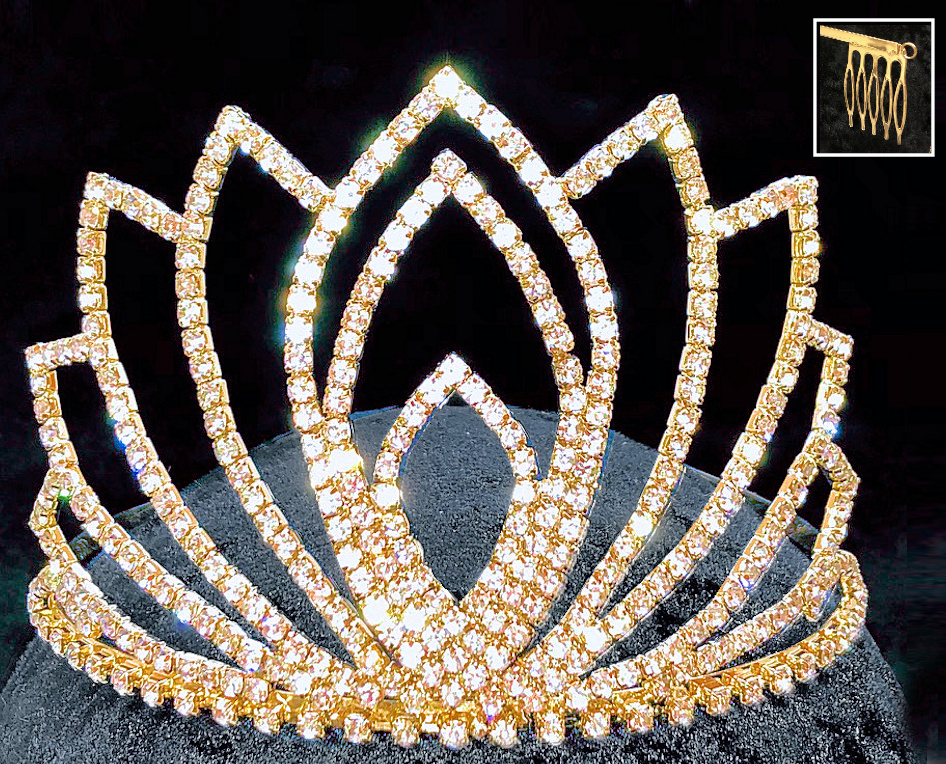 Look beautiful in this Rhinestone Tiara style # 267! The tiara is approximately 3.25″ high. It sits on a plated golden metal frame and has 2 metal combs attached to the ends. This is perfect for prom or wedding hair-do’s. Buy this for birthdays, Halloween, wedding day, prom or homecoming, beauty pageants, and other special occasions.