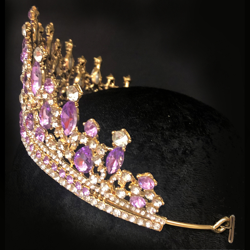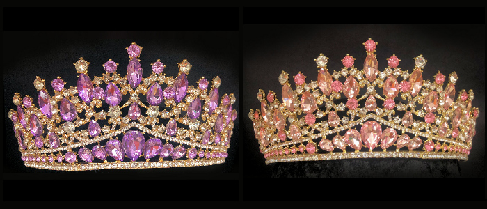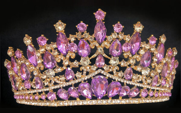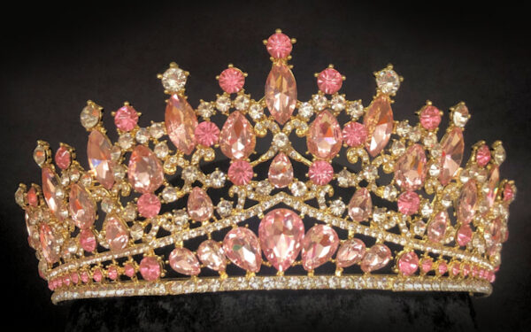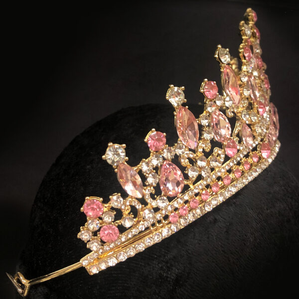 These striking Gold Rhinestone Tiaras are fit for a Queen! They are approximately 3″ high and feature a plated metal frame with shaped rhinestones in clear and pink or lavender. The arms end in open holes for bobby pins.This is perfect for birthdays, Halloween, wedding day, prom or homecoming, beauty pageants, costuming and other special occasions.