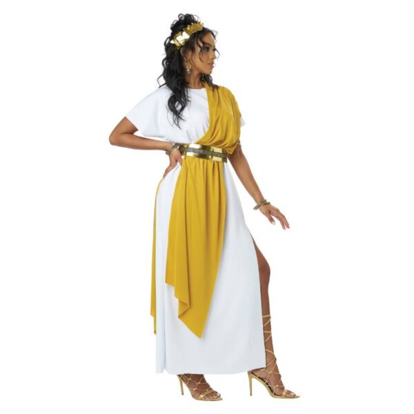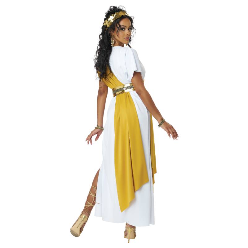 Wear Golden Goddess Adult Costume to present yourself as royalty. This luxurious toga includes a cream colored dress with one shoulder side decorated with shimmering gold fabric leaves. Glistening gold fabric drapes from one shoulder across the length of the dress. A gold belt piece catches the light and a gold leaf headband. The belt piece velcros securely in the back. A goddess is a woman who is adored. Charm the lucky people who get to be in the presence of a golden goddess.