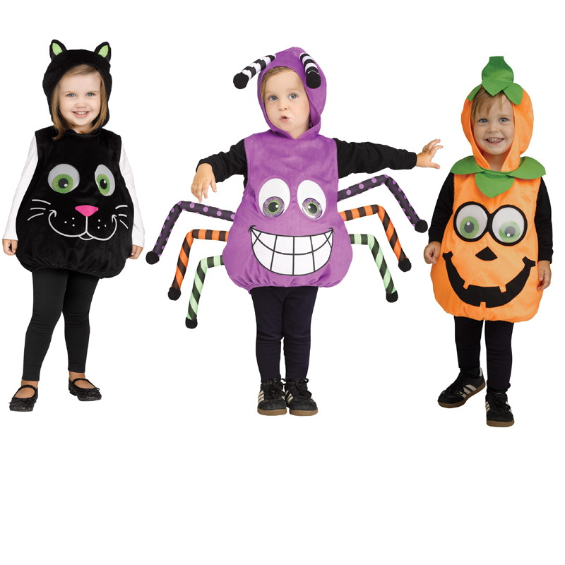 Googly-Eye black Cat, orange Pumpkin, or purple Spider Toddler Halloween Costume fits up to size 24 Months. Hooded Tunic with googly eyes is fun to wear!
