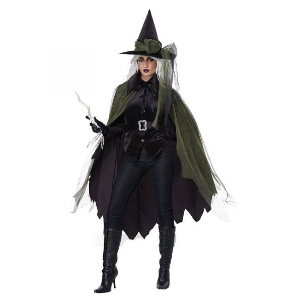Put a spell on the competition with Gothic Witch Adult Costume. This costume includes a button down jacket, a long skirt, a green and black layered over skirt which can be worn as a cape, a belt with decorative buckle, two hat ties and a two piece easy to assemble witch hat. Look dark, gorgeous, and mysterious. This costume compliments most body types so you can feel comfortable and confident all night long. The jacket/shirt is long sleeved and fitted. It is made from a velvet-like material. The witch hat gives an avante garde vibe. Wear a pair of leggings or other comfy pants under the skirt. Wear this gothic costume is versatile so you can wear it to more than one event.
