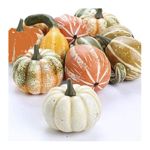 Gourd Pumpkin Assortment Fall Decoration – each netted bag contains six assorted 3.5 inch gourds and pumpkins. Colors vary. Set these on your Thanksgiving table!