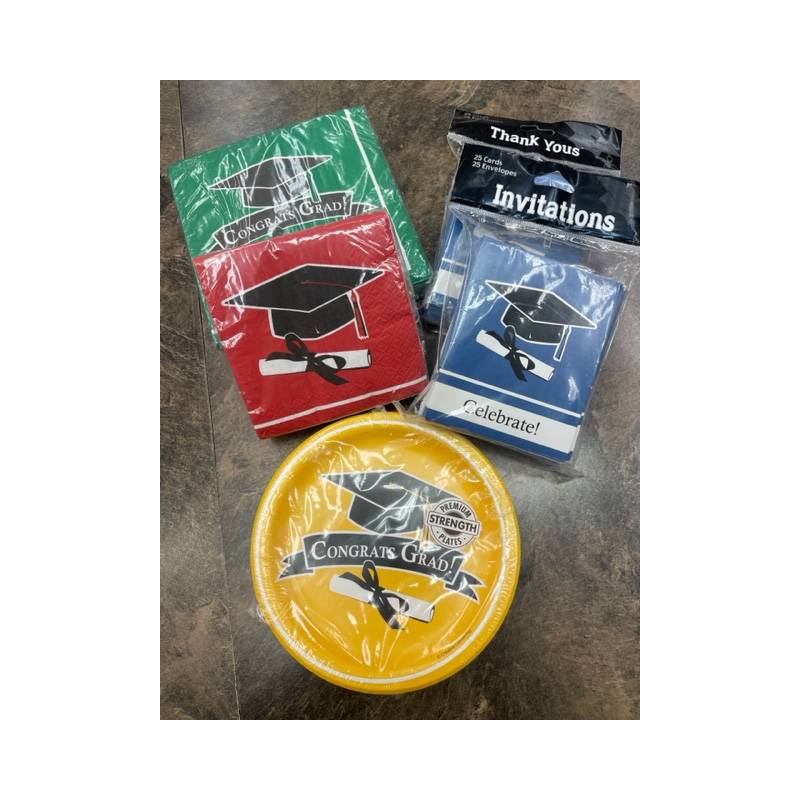 Grad Party Supplies! Pick from a variety of colors for napkins, plates, cards. The invitation and thank you cards help set the tone for the event and express gratitude to guests. And the napkins and plates feature stylish patterns or elegant designs that elevate the overall aesthetic of the celebration.