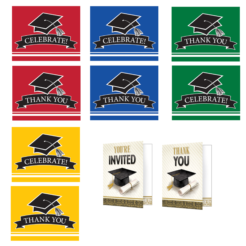 Color coordinate your graduation party invitations and thank you notes with your school’s colors! Choose solid or multi-colored cards with envelopes. 8 cards and 8 envelopes per package.