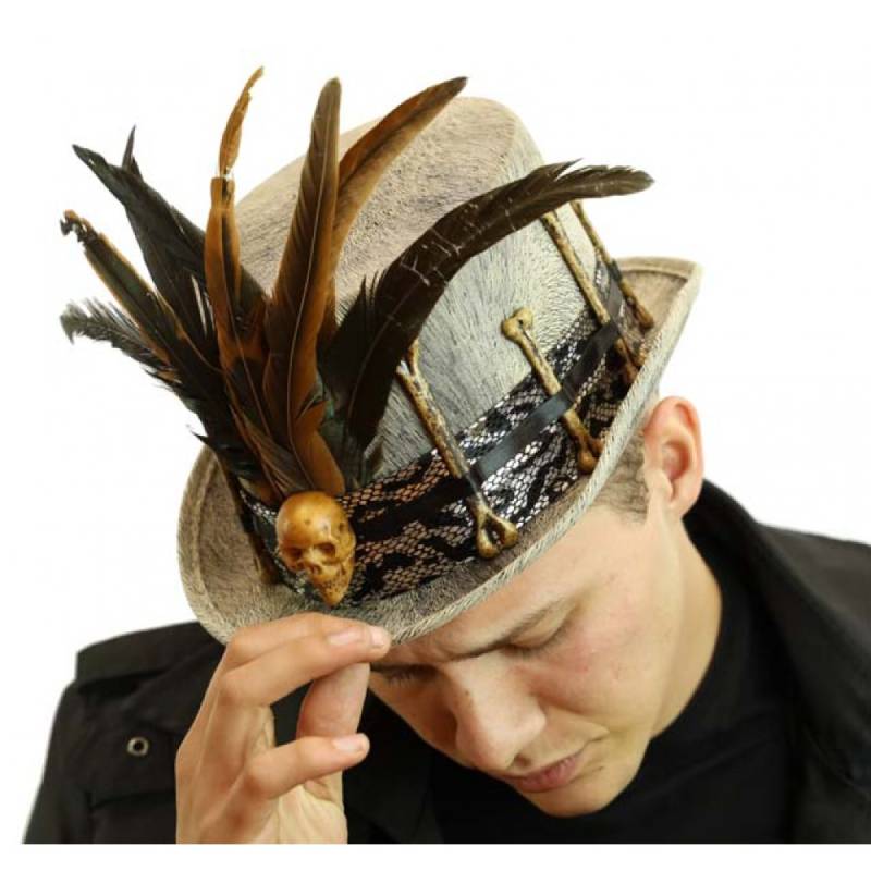 Buy this Gray Feather Printed Fabric Voodoo Tall Hat to wear to your Halloween Party! It looks great on! One size fits most men.