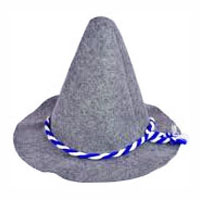 Here’s an inexpensive hat to wear to your German Oktoberfest event. It’s a great hat to wear to your Oktoberfest events! Look festive, fun, and really stand out! This gray hat is soft with a blue and white twisted cord above the brim of the hat.