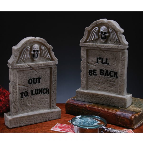 Play a joke on your co workers and colleagues with a Gray Plastic Desktop Tombstone Halloween Decoration. Choose I’ll be back or Out to Lunch. 5″ tall.
