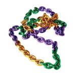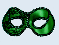 This green metallic half mask is trimmed in black and silver and has a black lace overlay on the left side. It is fastened by a double elastic strap.