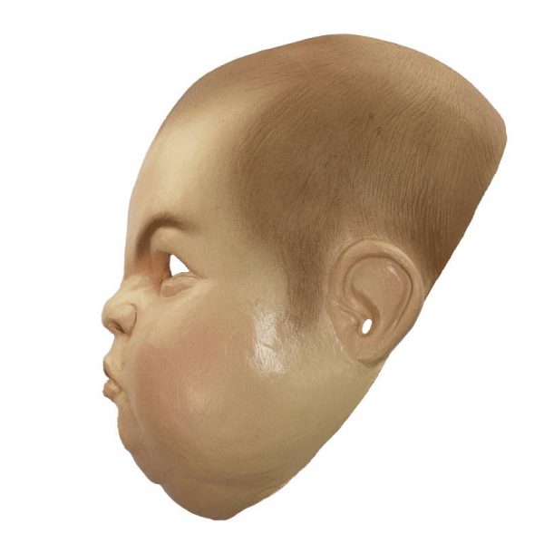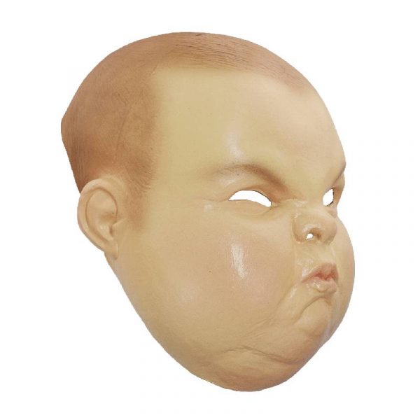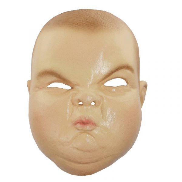 Grumpy Baby Mask Adult Size. Creepy and funny latex mask of a fussy baby. The mask is adult sized, and covers all sides of the face. Approx. 8 1/2 inches from top to bottom.