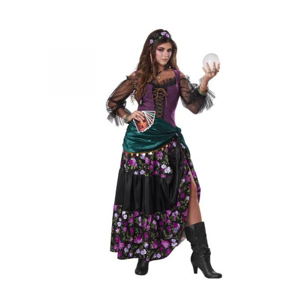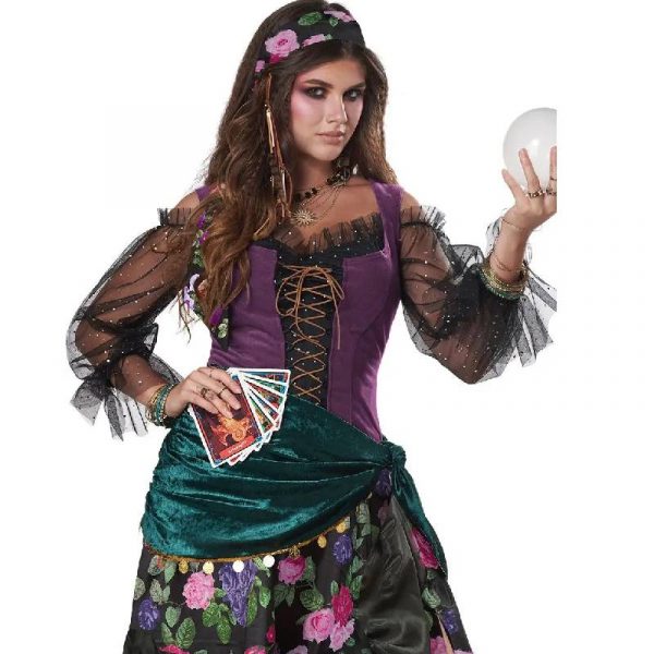 Become a mystical charmer this season. Wear this to a Halloween Party or to give out candy at your house this year! Buy this for themed parties, special occasions, cosplay, and more. This costume is a shirt and combined vest top. It has a sequined mesh shirt overlay and a long skirt that gathers up one leg. It also includes a removable hip sash with coin trim, a headband with floral print and 6 tarot cards.