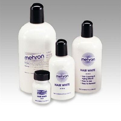 Hair White is part of a professional line made by Mehron. 1 fluid ounce bottle is a water washable liquid for greying hair of all types including wigs.