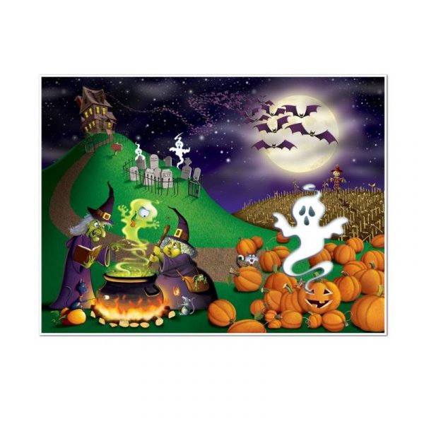 Halloween Insta-Mural depicts a perfect Halloween setting. It shows witches stirring up a wicked brew, ghosts, pumpkins, an abandoned corn field and a haunted house. This spook-tacular full wall decoration instantly creates a Halloween good time. It is made from light-weight plastic making it easy to hang with scotch tape or similar.