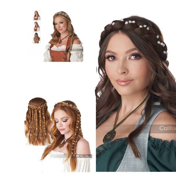 Halo Braids feature a braided ring with five smaller braids at the back. Each one also features small attached plastic flowers. Choose strawberry blonde, brunette, or dirty blonde.