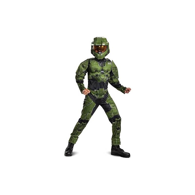 This officially licensed Master Chief costume, from the “Halo” video game series, is an iconic and distinctive armor suit worn by the protagonist, Master Chief Petty Officer John-117. The Master Chief armor is characterized by its sleek, futuristic design. It consists of a full-body exoskeleton made of highly durable and advanced materials, providing protection against various threats. The predominant colors of the armor are green and dark olive. The helmet is a crucial part of the costume, featuring a visor that has a gold or amber tint. The visor helps enhance vision and provides information overlays, reflecting the suit’s advanced technology.