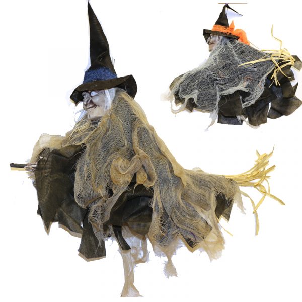 14″ Hanging Fabric Witch on a Broom will complete your Halloween decorations. Use this to hang from your ceiling or on a covered porch.