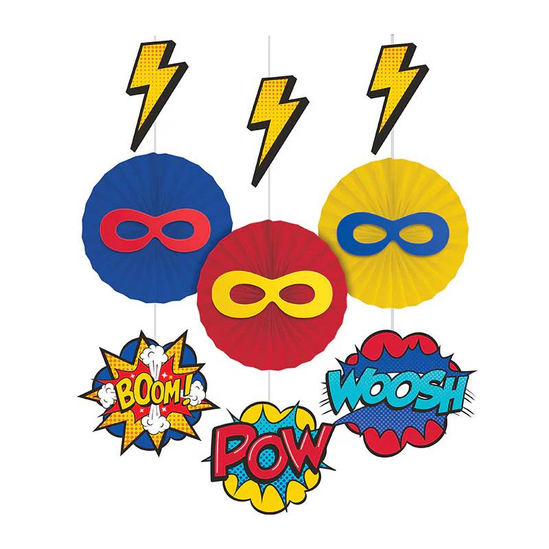 This Hanging Superhero Decor is a fun and vibrant decoration set for a superhero-themed party or event. These decorations include various hanging elements such as swirls and cutouts featuring popular superhero motifs and symbols.