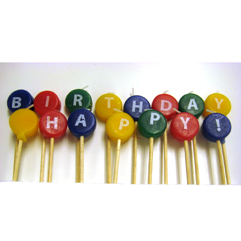 Use a Happy Birthday Candle Pick Set to light up your birthday party. Each little round candle is atop a toothpick and one side features one of the letters in Happy Birthday! The other side of each little round candle is blank. Burn time is less than 1 minute.