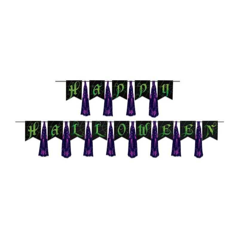 Set the spooky mood with Happy Halloween Tassel Streamer. This streamer can be linked together or used separately. Hang this in doorways or above the snacks table. The tassels will create a wave of Halloween fun. If assembled as shown in picture the streamers will measure 6′ x 13″ and 11′ x 13″.