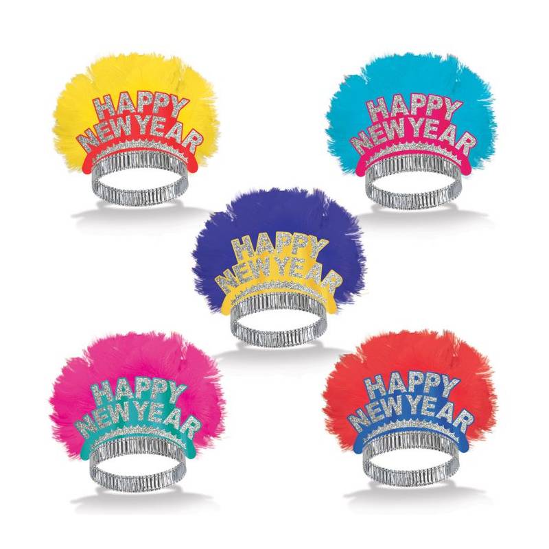 Happy New Year Bird of Paradise Tiara- Asst Colors will bring cheer to your celebrations. These brightly colored feathered tiaras fit most head sizes. Choose from yellow, pink, blue, purple or red.