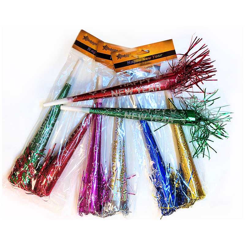 Give each guest at your New Year’s Eve party a Happy New Year 12 Inch Glittered Foil Horn. Horns come two per package, assorted colors. Colors shipped will be random.