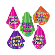Happy New Year Hats – Assorted colors and shapes. These Happy New Year Color Brite hats are bright and festive.