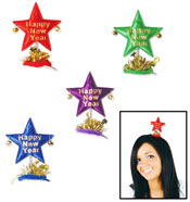 Happy New Year Star Hair Clip comes in red, blue, purple or green with gold lettering. There are tiny bells that dangle from the side points of the star. Gold metallic fringe lines the bottom.