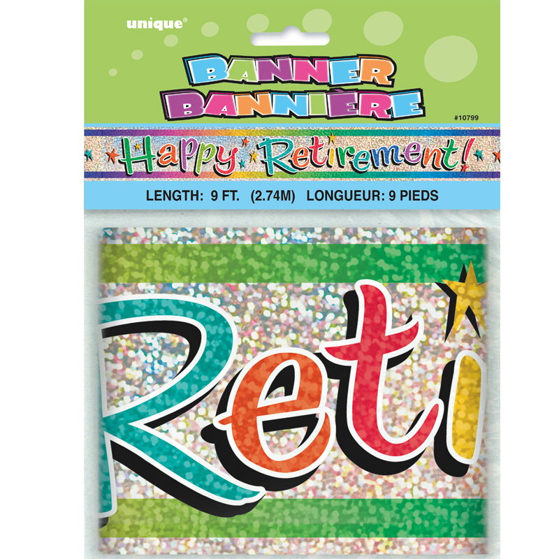 Happy Retirement! Prismatic Vinyl Banner is bright and sparkly this banner is 9′ long x 5″ wide. Celebrate the beginning of a new chapter. Hang this on wall or in doorways.