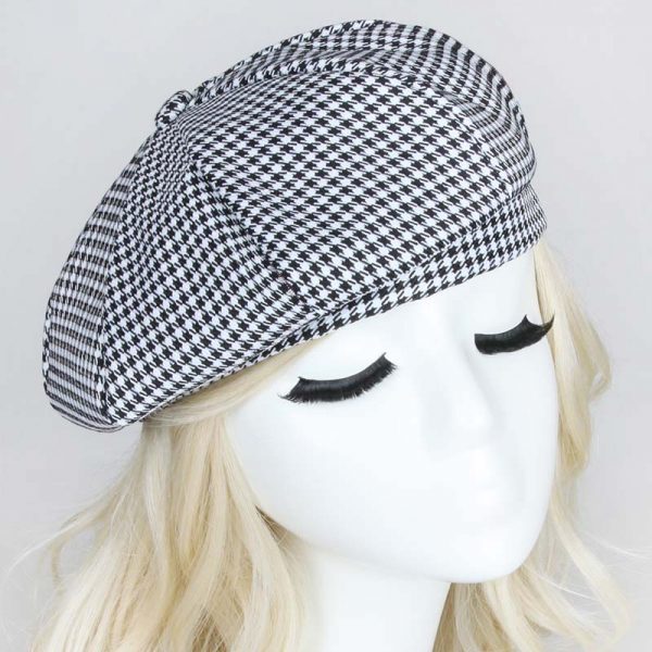 Wear this fashionable beret. Constructed of a cotton-poly blend fabric and features a fabric covered button at the top. Choose from Black/white or Brown Mix. Wear for everyday casual or for your favorite artsy costume.