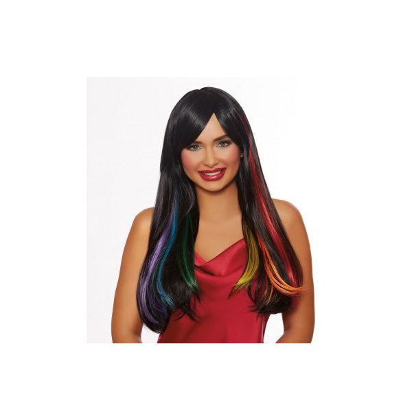 Adjustable, ready to wear, this Hidden Rainbow Long Straight Wig features long black hair with primary rainbow colors. Feels like Human Hair.