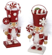 This is a colorfully painted and glittered wooden collectible nutcracker. It stands 7.5″ tall and features a red bucket filled with candy atop the soldier’s head.