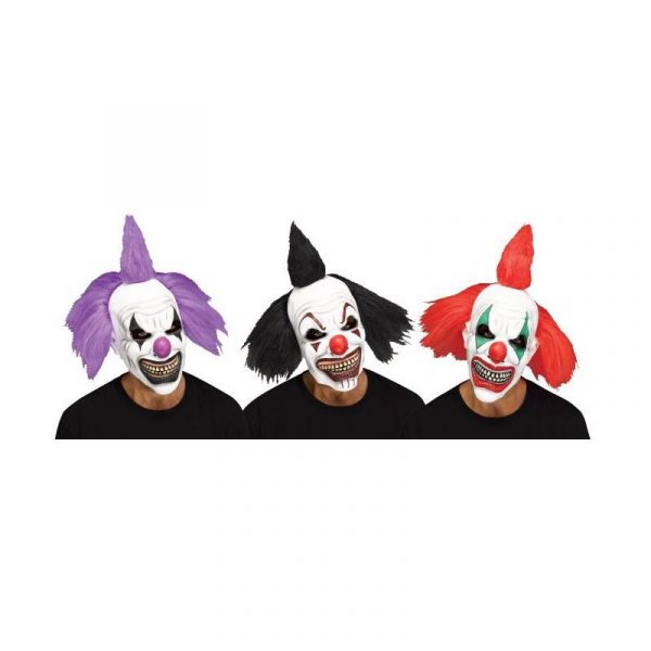 Wear this Hooligan Clown Scary Mask for Halloween! Mask features clenched teeth showing lots of tooth and gum decay and hair that matches the nose! Choose red, black, or purple!
