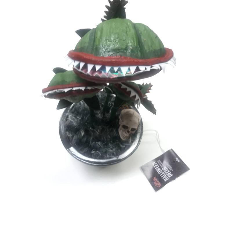 14″ Battery-operated Horror Shop Plant Prop with lights and sound. Press the attached button or switch it on from the bottom of the pot. Planter is decorated with a 2″ skull and gray fur.