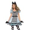 This lovely, sexy take on an Alice in Wonderland Halloween costume is sure to catch some eyes! The costume includes a black hair ribbon and a light blue satiny dress with lace and black ribbon trim, cap sleeves and an attached apron.