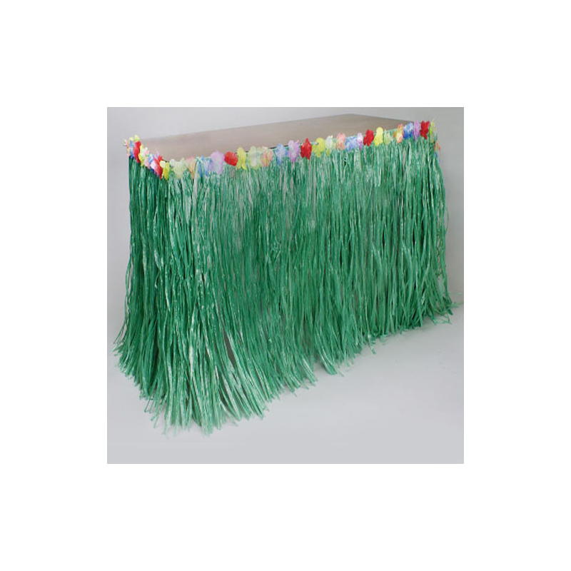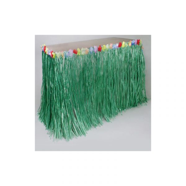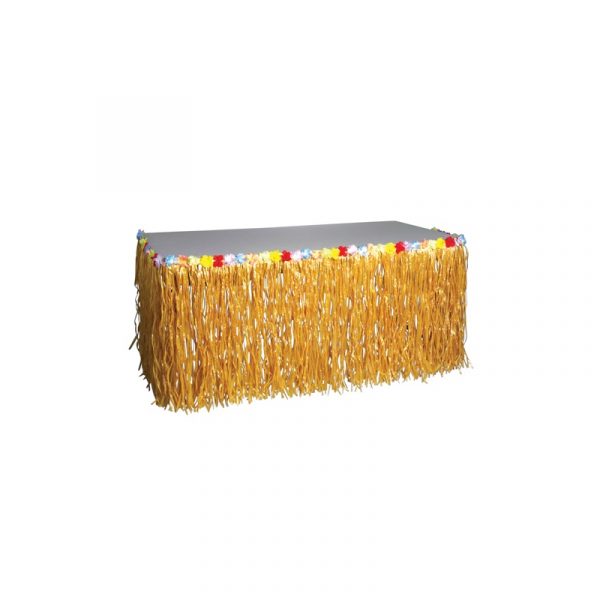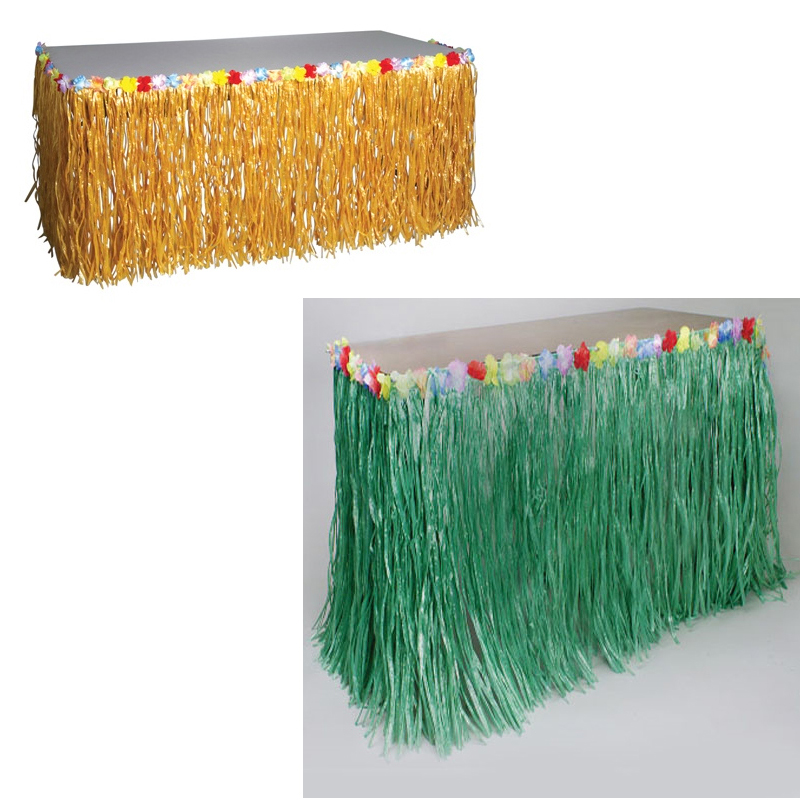 Choose a green or a natural looking cellophane raffia table skirt. Each one features flower trim along the top edge. Table skirts measure 29″ from table to floor and 108″ around the table. Perfect for Luau decor!