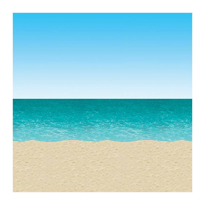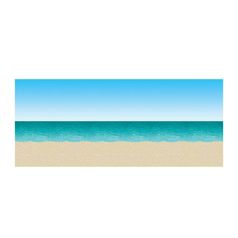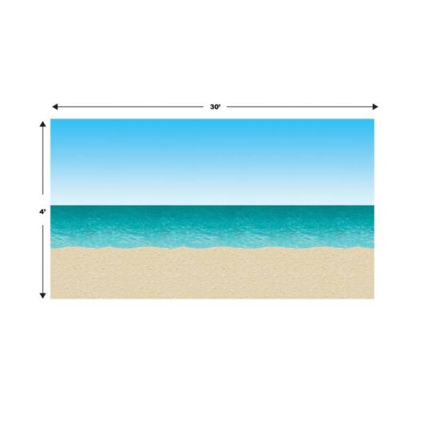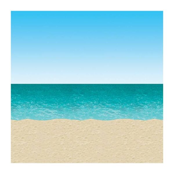 Ocean and Beach Backdrop. Backdrop of blue sky and ocean is printed on clear plastic and measures 4′ X 30′. It can be used for a luau party, beach scene, or whatever you can imagine. Add other backdrops and add-on’s to make the perfect scene.