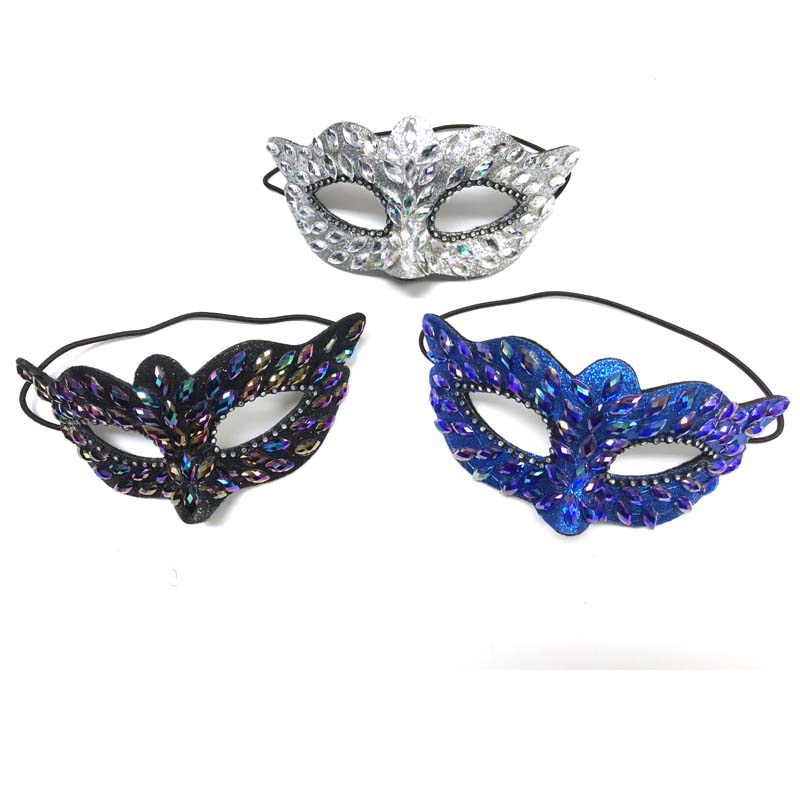 The blue and the black masks feature multi-color jewels. The silver mask features clear iridescent jewels.
