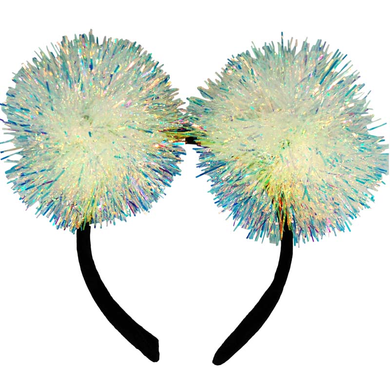 This Iridescent Snowball Tinsel Headband is perfect for events like Blink Cincinnati, Burning Man, or even Halloween! Plastic Headband, covered by very soft black plush fabric, holds the two snowball pom poms.