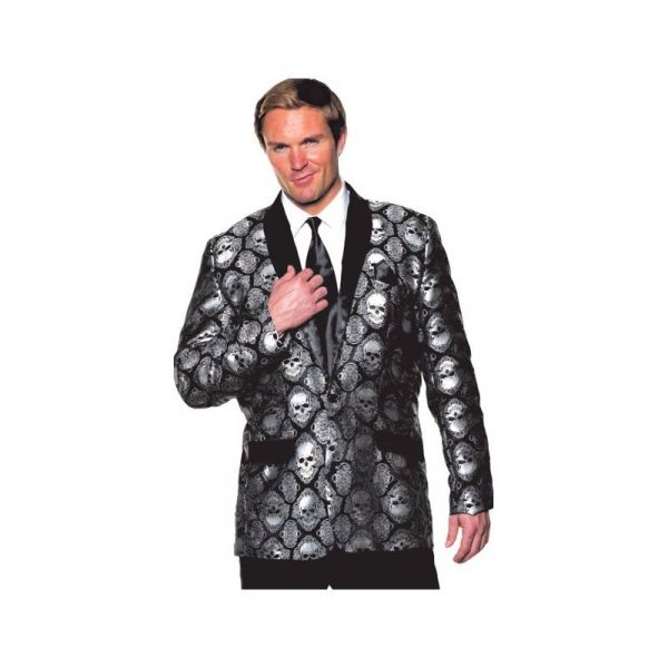 Jacquard Jacket w Silver Skulls is a handsome piece of clothing. This jacket is upper class with a dark side. Wear this to Halloween parties. Use this jacket for other occasions where jackets are required.