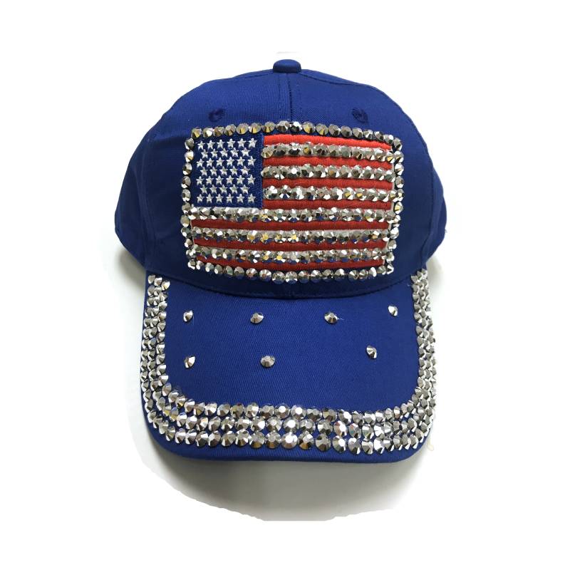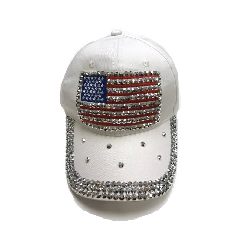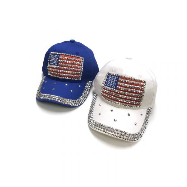 This Fourth of July, wear a Jeweled US Flag Cap w Rhinestones. Choose a white or blue ball cap for 4th of July. Each cap features a US Flag design with rhinestones outlining the flag. There are three rows of rhinestones on the edge of the brim as well as seven more rhinestones dotting the bill! Rhinestones also form the white stripes of the flag. Each cap includes a small package of spare rhinestones.