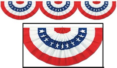Red, white and blue stars and stripes patriotic bunting is a triple wide jointed cardboard panel. Each section measures 2′ long x 12 inches top to bottom, for a total length of 6′. It is printed on both sides, and would make a great decorative piece for many patriotic events.