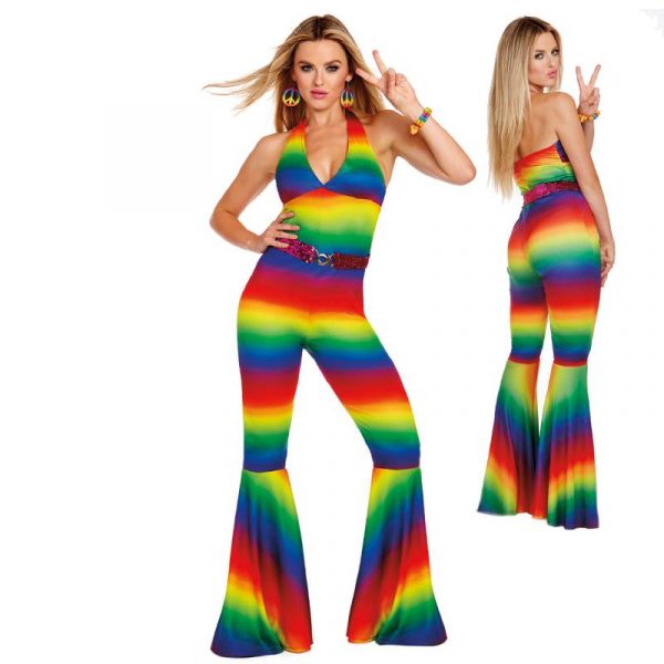 This rainbow jumpsuit features wide bell bottoms and a halter-top style! Costume includes a hot pink sequin elastic belt.