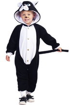 The outfit choice is a leopard print dress. Leopard print features black spots on a background of soft tan material. The dress is long-sleeved with layered sparkle tool fringe around the cuffs. The costume is typically made of a lightweight and comfortable material like polyester. Buy this for cute pictures and fun memories. Additionally, buy cat whiskers to add cat appeal.