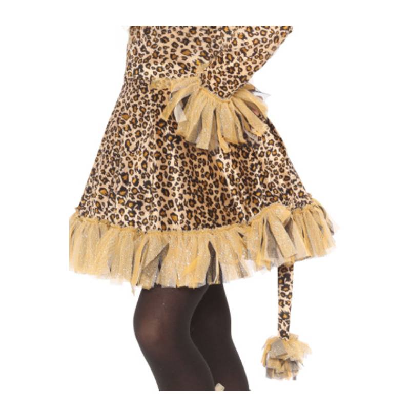 The Jungle Leopard Girls Costume comes with additional accessories in leopard print pattern. These include a headband with attached ears and leg warmers with attached layered sparkle tool fringe.