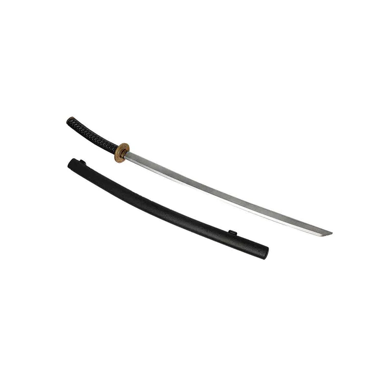 This katana with sheath is a costume accessory designed to evoke the elegance and martial spirit of Japanese samurai swords. The katana itself is designed to resemble a traditional Japanese samurai sword. It features a curved, single-edged blade known for its sharpness and effectiveness in combat. The katana and its sheath are usually made from lightweight plastic. Despite its appearance, the blade is not sharp and is designed purely for visual effect. The sheath (or scabbard) is an integral part of the ensemble, designed to securely hold the katana when not in use. It is crafted to mimic the traditional lacquered wood or leather construction of authentic samurai sword sheaths.