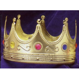 This crown is gold pated plastic with colorful plastic jewel decorating the band. One size fits most adults. Gold detailing in between each jewel.