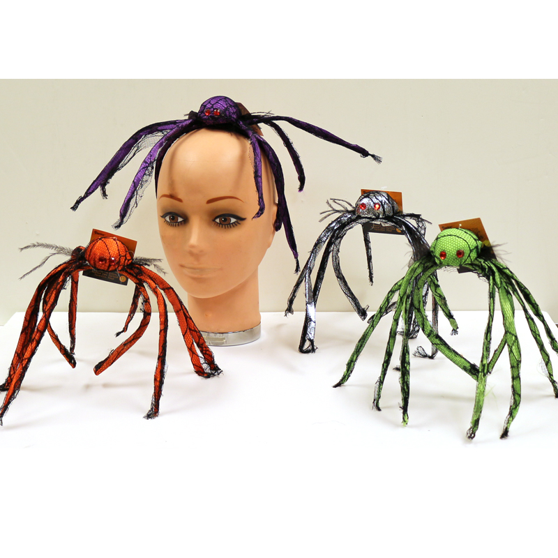 Lace Fabric Spider Headband comes in green, silver, orange and purple with a black lace over lay and red eyes. Bend the legs to customize your look. Go as a group!