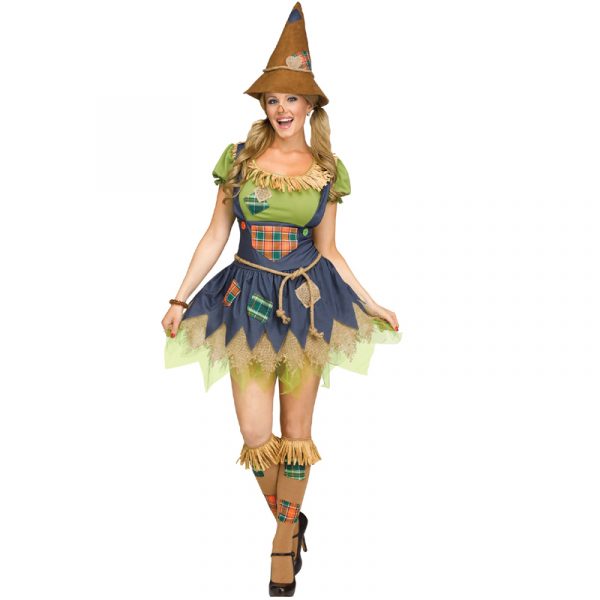 This Ladies Scarecrow costume is so cute! Package includes Dress, belt, knee high socks, and matching pointy scarecrow hat.