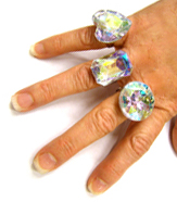 Large iridescent costume rings are available in 3 styles. Jewel is approximately 1″ across.